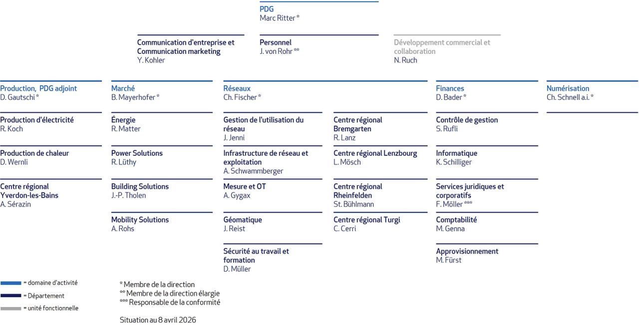 AEW Energie AG est structurée en cinq secteurs : production, marché, réseaux, finances et numérisation.