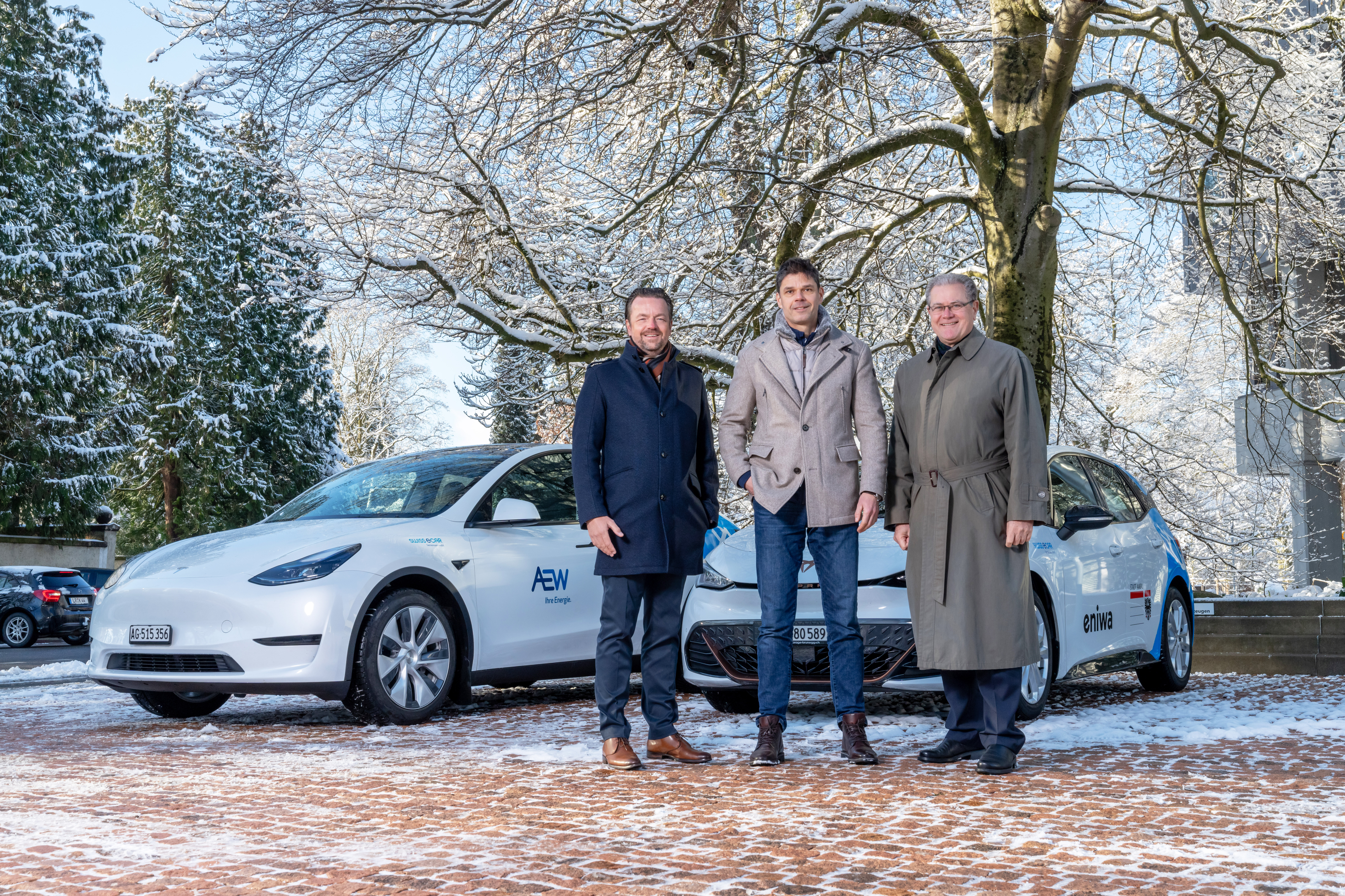 vlnr.: Marc Ritter, CEO AEW Energie AG, Arian Rohs, CEO Swiss E-Car AG, Hans-Kaspar Scherrer, CEO Eniwa AG
