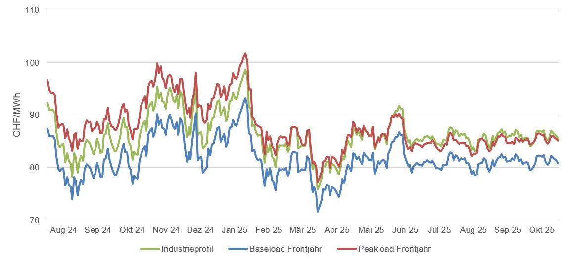 In den Herbstmonaten blieb die Volatilität auf einem niedrigen Niveau. Die Jahrespreise bewegten sich seitwärts innerhalb eines Bandes von etwa 5 CHF/MWh. Bei den Herkunftsnachweisen führt die gute Wasserführung in der Schweiz aktuell zu sinkenden Preisen für die Lieferjahre 2025 und 2026.