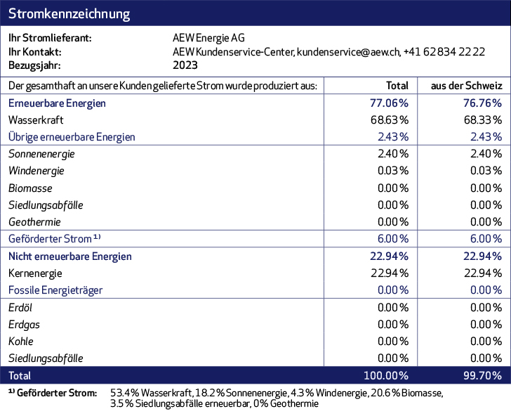 Einmal jährlich informieren wir über die Herkunft des im Vorjahr gelieferten Stroms. Ausgewiesen werden dabei die Anteile der eingesetzten Energieträger sowie die Herkunft der Elektrizität (Produktion im Inland oder Ausland).